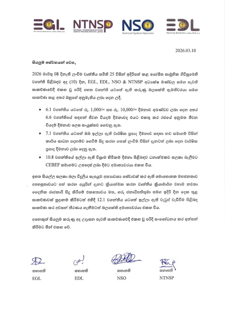 එම ලිපියේ සඳහන් වන්නේ 2026 මාර්තු 08 දිනැති ලංවිම වෘත්තීය සමිති 25 විසින් ඉදිරිපත් කළ යෝජිත සාමූහික ගිවිසුමෙහි වගන්ති පිළිබඳව අද (10) දින EGL, EDL, NSO & NTNSP අධ්යක්ෂමණ්ඩල සමඟ පැවති සාකච්ඡාවේදී එකඟ වූ පරිදි පහත වගන්ති යටතේ ඇති කරුණු බලශක්ති ඇමතිවරයා සමඟ සාකච්ඡා කළ අතර ඔහුගේ අනුමැතිය ලබා ගත් බවයි.