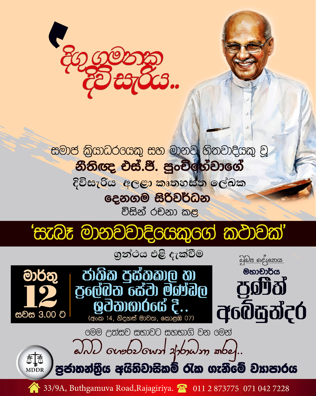 2026 මාර්තු 12 දින 93 වැනි වියට පා තබන ප්රවීන ලේඛක හා මානව අයිතිවාසිකම් ක්රියාධරයෙකු වන එස්. ජී. පුංචිහේවා ගේ දිවි සැරිය අලළා කෘතහස්ත ලේඛක දෙනගම සිරිවර්ධන රචනා කල “සැබෑ මානවවාදියෙකුගේ කතාවක්” ග්රන්ථය එළි දැක්වීමල කොළඹ 07” නිදහස් මාවතේ පිහිටි ජාතික පුස්තකාල හා ප්රලේඛන සේවා මණ්ඩල ශ්රවනාගාරයේ දී සිදු කෙරේ.