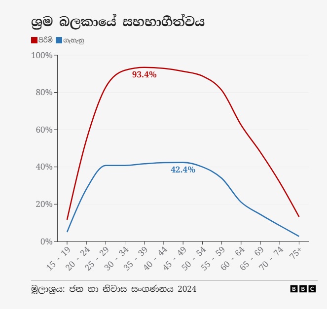 ඕනෑ ම වයස් කාණ්ඩයක් තුළ කාන්තා සහභාගීත්වයේ උපරිමය 42.4% ඉක්මවා නොගොස් ඇති අතර, පිරිමින්ගේ වයස අවුරුදු 25 සිට 59 දක්වා ශ්රම බළකායේ සහභාගීත්වය 80%ට වඩා වැඩි ය.
