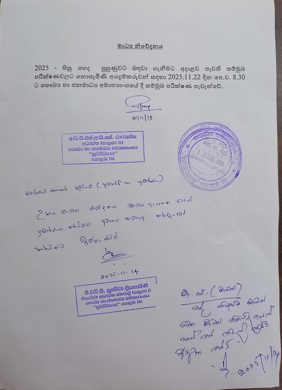 පසුගිය (2025) සිසු හෙද පුහුණුව සඳහා පැවැති සම්මුඛ පරික්ෂණ සඳහා සහභාගිවීමට නොහැකි අයදුම්කරුවන් සඳහා 2025. 11. 22 දින පෙරවරු 8.30 වන විට කොළඹ සෞඛ්ය හා ජනමාධ්ය අමාත්යංශයේදී සම්මුඛ පරික්ෂණ පැවැත්වීමට කටයුතු යොදා ඇත.
