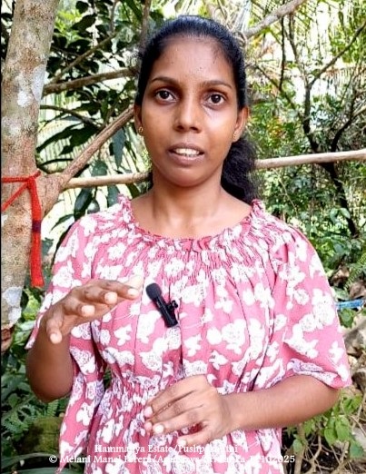 “මගේ නම එස්. පුෂ්පකාන්ති. මම ඉපදුණේ, හැදුණේ වැඩුණේ හැම්මෑලිය කියන මේ වත්තේ. මගේ අම්මා තාත්තා ඉපදුණේ මේ වත්තේ, මගේ ආච්චිලා සීයලා මී මුත්තලා හැමෝම ඉපදුණෙත් මේ වත්තේ. ඒ ගොල්ල මේ වත්තේ ජීවත්වුණා විතරක් නෙවෙයි, 1945 ඉඳලා දහදිය මහන්සියෙන් වෙහෙසිලා හැම්මෑලිය වත්තට තමා හම්බකරලා දීලා තියෙන්නේ. 2025 වන තුරු වත්තේ පදිංචිවෙලා ඉන්න අපිට දැන් වත්තෙන් යන්න කියනවා. යන්න කිව්වට අපිට යන්න තැනක් නැහැ. අපි කොහේ යන්නද? වත්තේ කුරුඳු දැම්මට පස්සේ අපේ අයට රස්සාව නැහැ. ඒ නිසා අපේ දෙමාපියෝ එදා වේල හොයාගෙන ජීවත්වෙන මිනිස්සු. අනික මේ වත්තේ ඉගෙන ගන්න ළමයි ඉන්නවා. ඒ ළමයිගේ අධ්යාපනයට මොකද වෙන්නේ. ඉතිං වත්තේ නෝනලාගේ ඉල්ලීම සාධාරණද කියල මම අහනවා?” යැයි පුෂ්පකාන්ති කිීවේය.