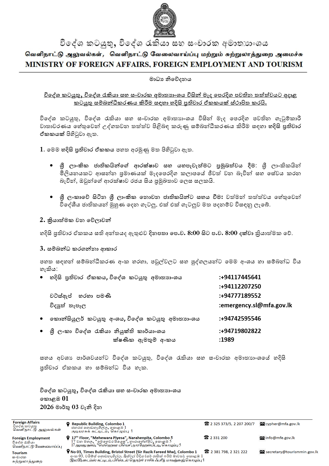 මැදපෙරදිග පවතින තත්ත්වය සැලකිල්ලට ගෙන විදේශ කටයුතු, විදේශ රැකියා සහ සංචාරක අමාත්යංශය විසින් හදිසි ප්රතිචාර ඒ්කකයක් ස්ථාපිත කර ඇත.