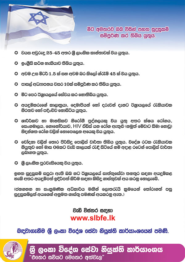 ඔබත් ඊශ්‍රායලයේ රැකියාවක් අපේක්ෂාවෙන් පසුවෙන ලාංකිකයෙකු නම් පහත දැක්වෙන නිවේදන අවබෝධයෙන් කියවා බලන්න.