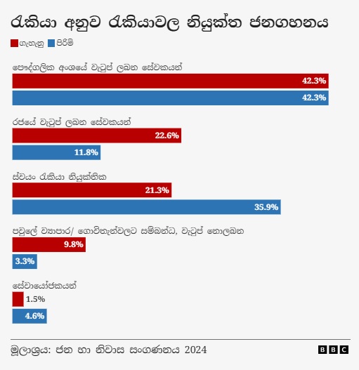 රැකියාවල නියුතු කාන්තාවන් වැඩි පිරිසක් රජයේ රැකියාවල නිරත වන අතර, ආර්ථික වශයෙන් ක්රියාකාරී, රජයේ රැකියා කරන කාන්තාවන් සංඛ්යාව 22.6%ක් වන විට එහි පිරිමි ප්රතිශතය 11.8%කි.