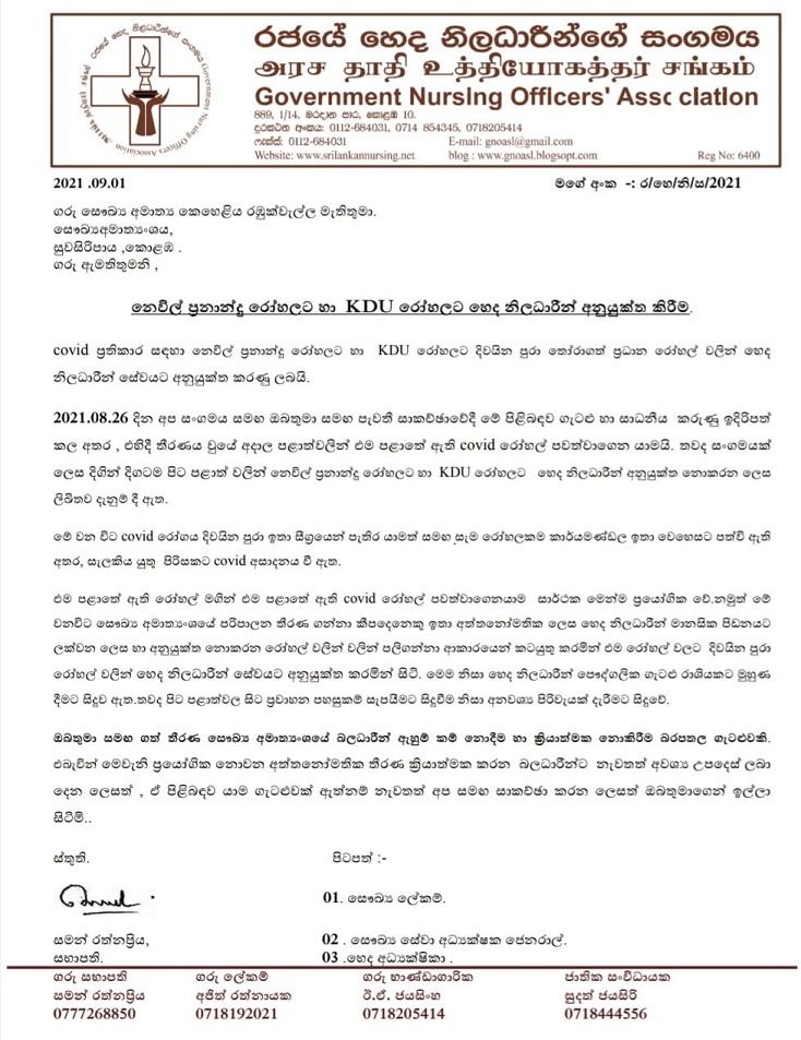 හෙද නිලධාරින් පිටපලාත්වලින් නෙවිල් ප්රනාන්දු රෝහලට හා KDU රෝහලට අනුයුක්ත නොකිරීමට සෞඛ්ය අමාත්යවරයා එකඟවී තිබියදීත්, සෞඛ්ය අමාත්යංශයේ පරිපාලන තීරණ ගන්නා කිහිපදෙනකුගේ අත්තනොමතික ලෙස හෙද නිලධාරින් මානසික පීඩනයට ලක්වන හා පලිගන්නා ආකාරයෙන් කටයුතු කිරීම සම්බන්ධයෙන් රජයේ හෙද නිලධාරින්ගේ සංගමය විසින් සෞඛ්ය අමාත්යවරයා වෙත ලිපියක් යවා ඇත.