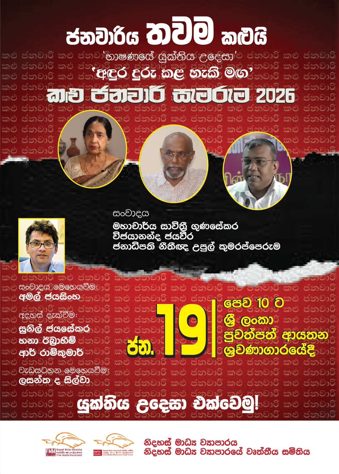 ‘කළු ජනවාරිය’ යනු උත්සවශ්රීයෙන් සැමරිය යුතු තවත් එක් දින දර්ශන සටහනක් හෝ ප්රදර්ශනාත්මක ‘සෙලිබ්රිටි’ සැණකෙළියක් නොවේ. එය වසර ගණනාවක් තිස්සේ ශ්රී ලංකාවේ ජනමාධ්ය නිදහසට එරෙහිව එල්ල වූ ම්ලේච්ඡ මර්දනයට එරෙහිවත්, ඝාතනයට, ප්රහාරයන්ට හා අතුරුදහන් කිරීම්වලට ලක් වූ මාධ්යවේදීන්ට සහ මාධ්ය සේවකයන්ට යුක්තිය ඉටු කරන ලෙස රජයන්ට බලකර සිටින ප්රබල දේශපාලන හෘදසාක්ෂියයි.